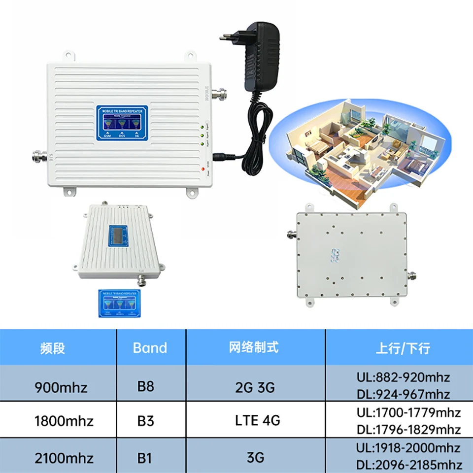 4G 3G 2G 900 1800 2100 mhz 3-Band Cell Phone Cellular Signal Repeater Amplifier LTE wcdma Mobile Phone Signal Booster Item NO.: F47098-D1 F47098-D2 F47098-D3